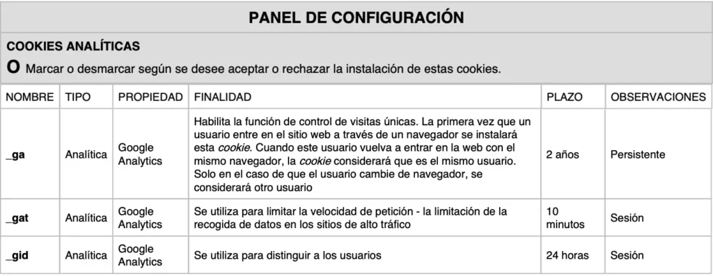 COOKIES UTILIZADAS EN ESTE SITIO WEB